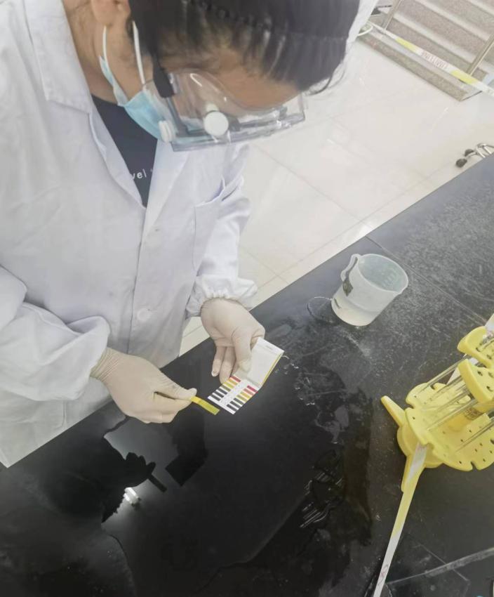 演練主要內(nèi)容為模擬實(shí)驗(yàn)室發(fā)生濃硫酸泄露致使化驗(yàn)員手部灼傷的場景。事故發(fā)生后,科室負(fù)責(zé)人立即啟動危險化學(xué)品安全事故應(yīng)急處理預(yù)案進(jìn)行指揮救助處置。安排一人用濾紙或紗布等物品將傷者手上殘留的硫酸吸去,減去手套,用大量水沖洗,繼續(xù)用5%碳酸氫鈉溶液沖洗。其它人員負(fù)責(zé)現(xiàn)場硫酸的處理工作,拉起警戒線,并用堿石灰將散落的硫酸覆蓋,將石灰收集到一起。然后用水沖洗地面,測試廢水的PH值,合格后用抹布擦洗地面。事故警戒、應(yīng)急救援、泄露處置、環(huán)境恢復(fù)等工作緊張有序開展,受傷員工得到有效救護(hù),濃硫酸泄漏得到有效控制,未對環(huán)境和實(shí)驗(yàn)室安全運(yùn)行產(chǎn)生不良影響。