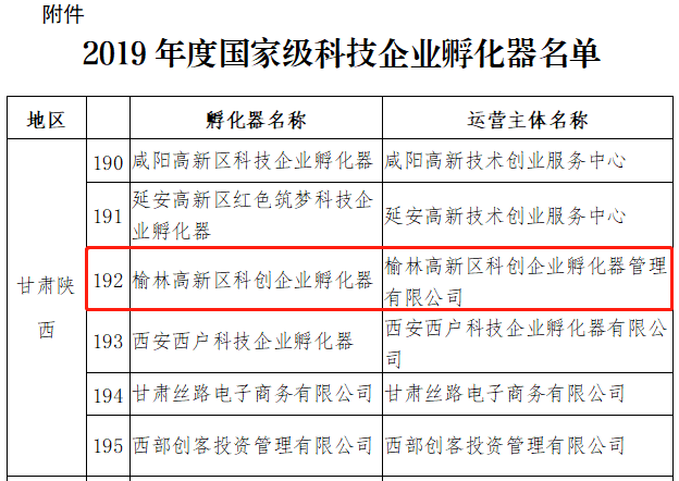 12月23日,根據(jù)《科技企業(yè)孵化器管理辦法》(國(guó)科發(fā)區(qū)〔2018〕300號(hào))的相關(guān)標(biāo)準(zhǔn)和要求,2019年經(jīng)各省級(jí)科技主管部門評(píng)審?fù)扑],火炬中心組織專家審核,在國(guó)家科技部火炬中心公布的最新一批家國(guó)家級(jí)科技企業(yè)孵化器名單中,榆林高新區(qū)科創(chuàng)企業(yè)孵化器管理有限公司榜上有名。實(shí)現(xiàn)了榆林市國(guó)家級(jí)科技企業(yè)孵化器零突破。